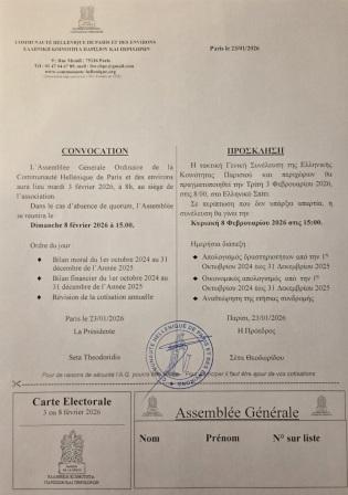 Partage de la Vassilopita 2026 Η Κοπή της Βασιλόπιτας της Ελληνικής Κοινότητας Παρισιού και Περιχώρων και της Κυπριακής Κοινότητας Γαλλίας πραγματοποιήθηκε την Κυριακή 11 Ιανουαρίου 2026, στο Ελληνικό Σπίτι (Maison de la Grèce). Πλήθος κόσμου από την ελληνική και κυπριακή παροικία κατέκλυσε τον χώρο σε ένα ιδιαίτερα γιορτινό και ζεστό κλίμα! (lire la suite... sur: www.thesnewsline.com) (voir la vidéo... sur YouTube)